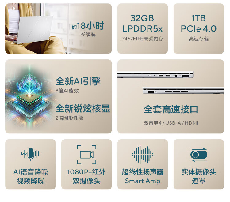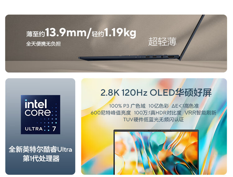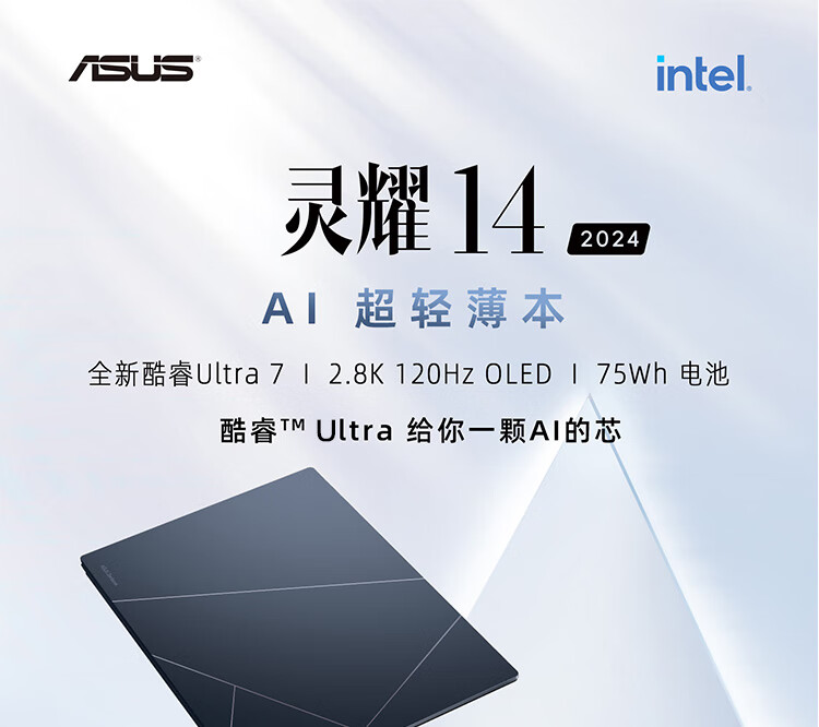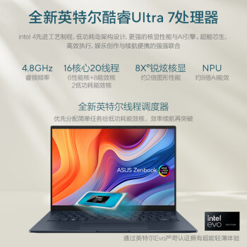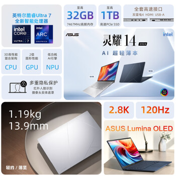 华硕灵耀14 2024酷睿标压Ultra7 2.8K120Hz OLED屏高颜值AI超轻薄商务办公笔记本电脑(155H 32G1T) 蓝