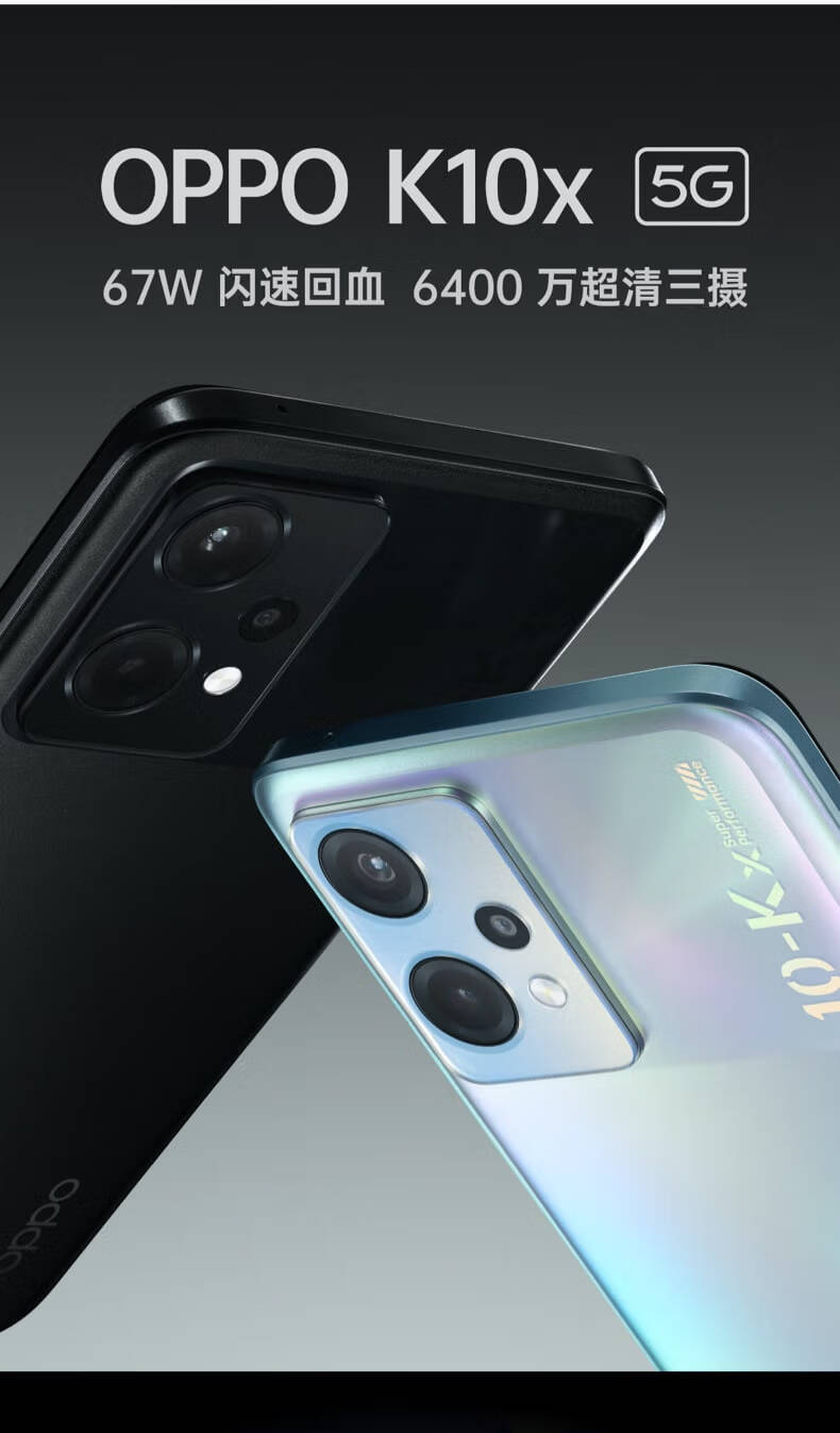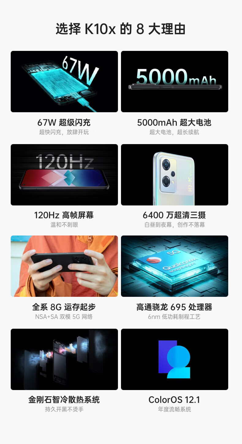 商品名称:OPPO K10x 极光 8GB+256GB 67W超级闪充 5000mAh长续航 120Hz高帧屏 6400万三摄 高通骁龙695 拍照 5G手机