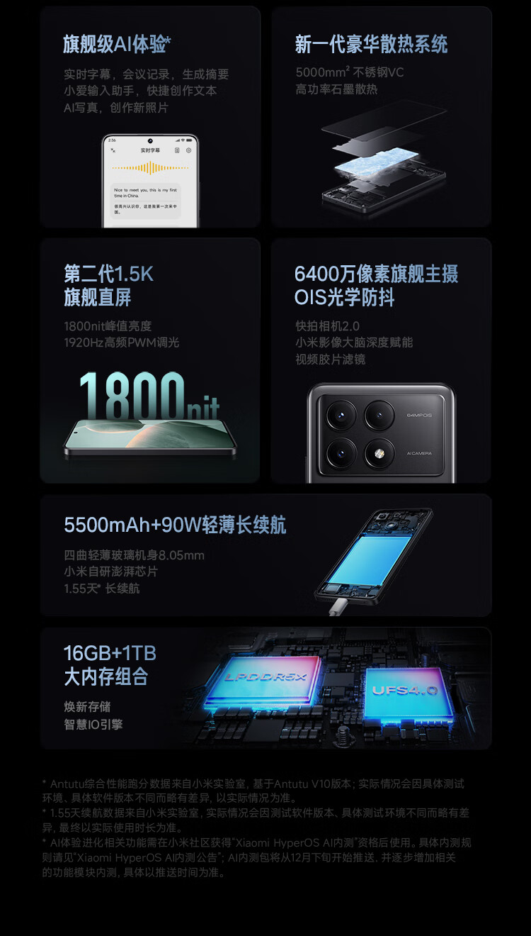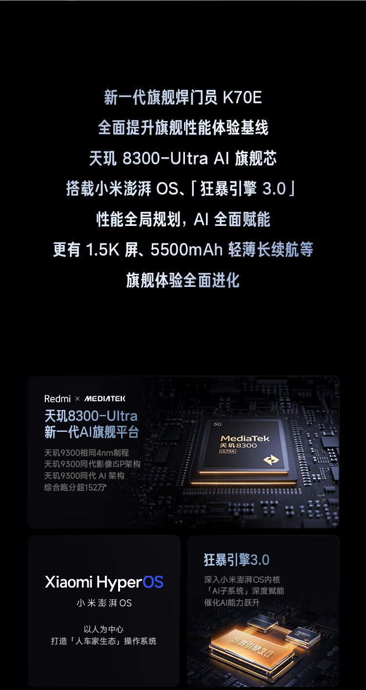 小米(MI)Redmi K70E 天玑 8300-Ultra 小米澎湃OS 1.5K 旗舰直屏 8GB+256GB 墨羽 小米红米K70E