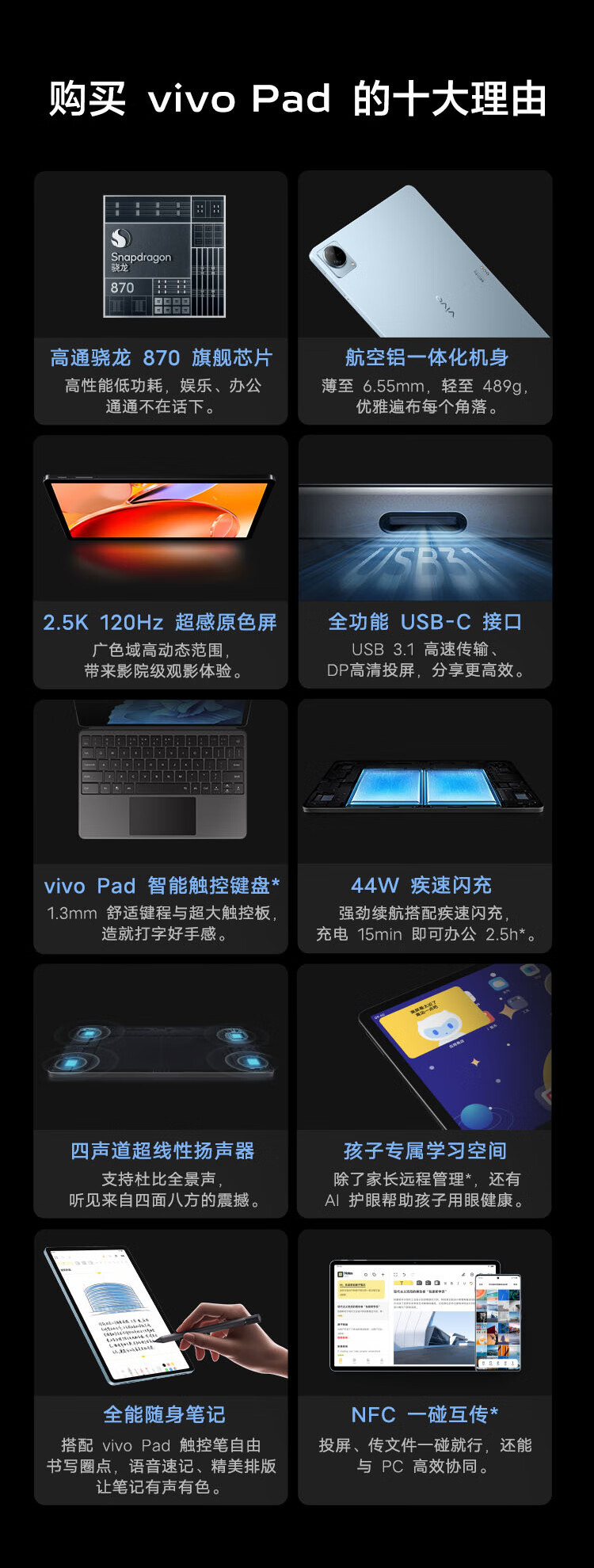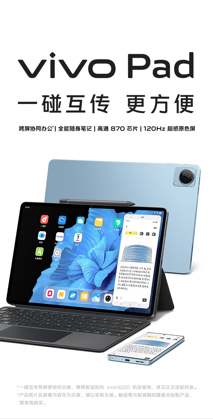 vivo Pad 平板电脑 8GB+256GB 天蓝色 高通骁龙870 航空铝一体化机身 120Hz超感原色屏 44W疾速闪充